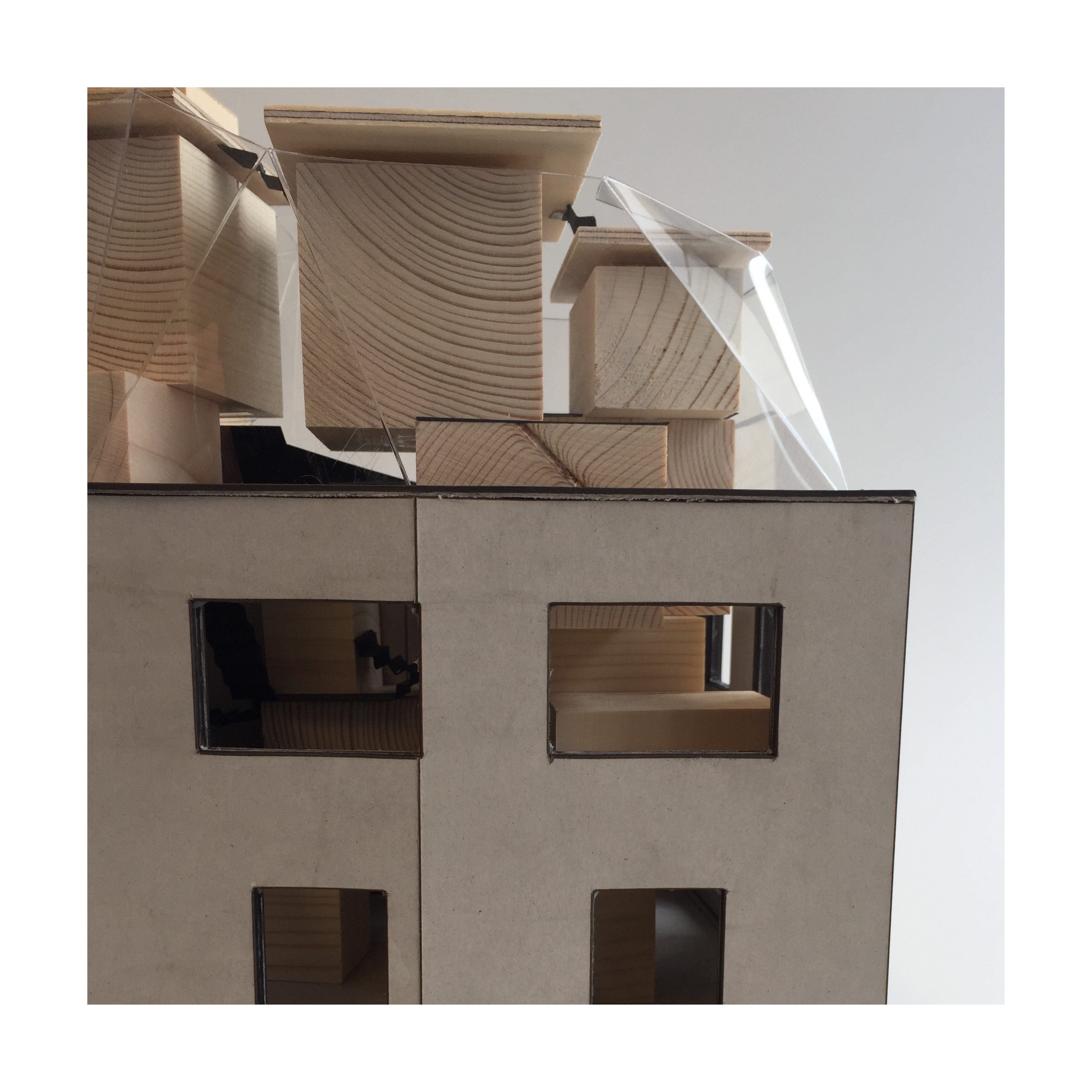 There are to towers of boxes – the ‚Bathroom’ and the ‚Bed‘ tower – which merge at the peak to its shared roof terrace. Different types of BedBoxes are single BedBox as well as double BedBox – separate beds or double bed – and a Box for four. Equally there is a set of BathBoxes, which are separated by shower and toilet. Storage and office Boxes are provided too; plus the KitchenBox.