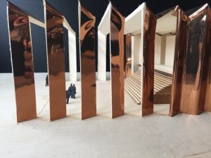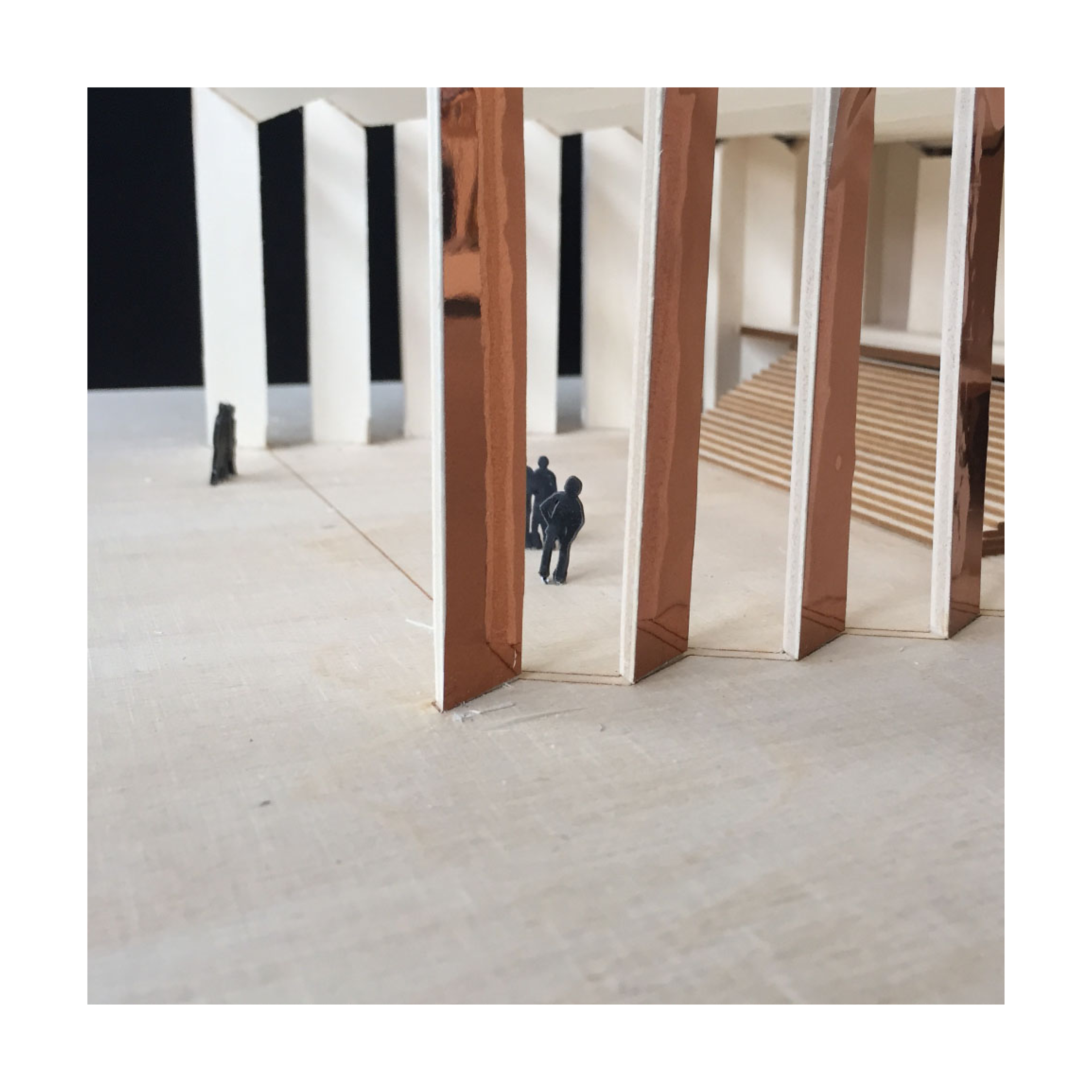 The form to the theater reflects the play between real and unreal – audience and protagonists. Hence it imitates the traditional picture stage in both parts – just the covering is different. As the proscenium is a opak room, the foyer is permeable – that means that the foyer has got views to the surroundings like the viaduct and the river. Last but not least the theater covering is made like a folded plate to have a better acoustics and reminding of a theatre curtain. According to this the building is constructed out of timber panels which are force-fit interconnected. The timber panels make a temporary building possible, what means that you can set it up again and again – everywhere you want.